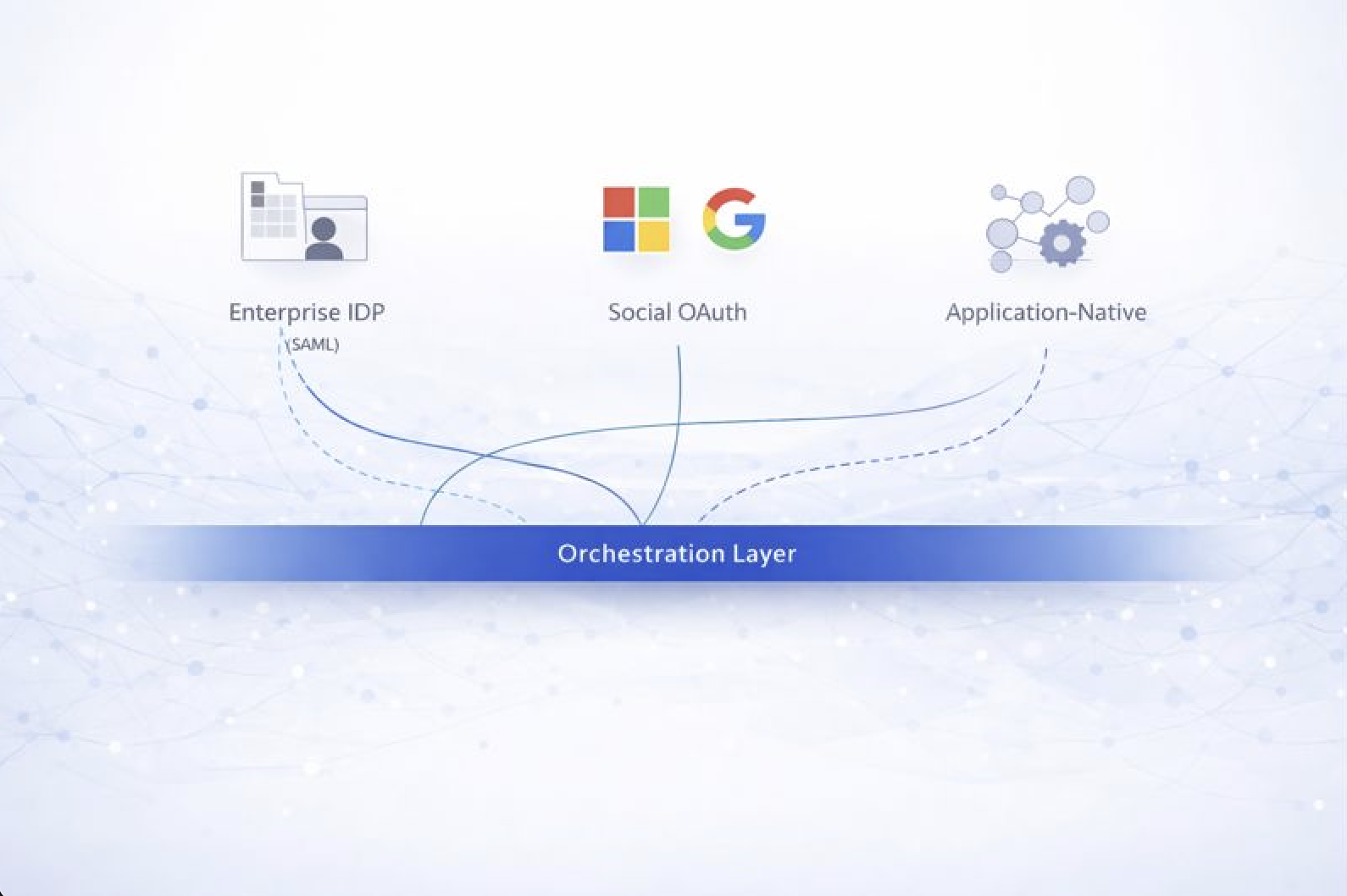 Here, applications authenticate directly through Microsoft or Google using OAuth/OIDC.