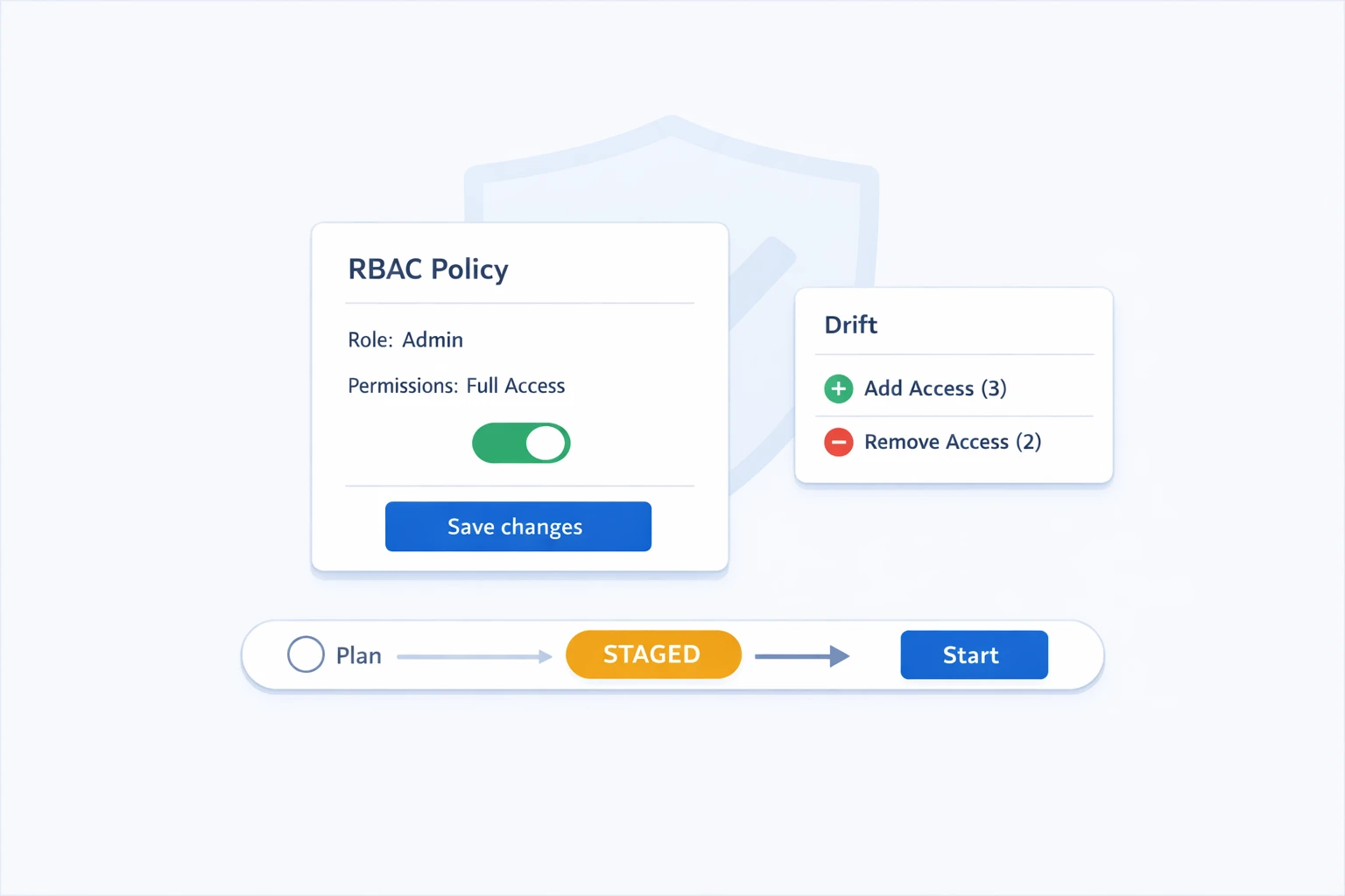 RBAC Policy updates are now easier to manage in one place. When you edit a policy, changes are batched and saved together, with a preview of the new drift those changes would create.